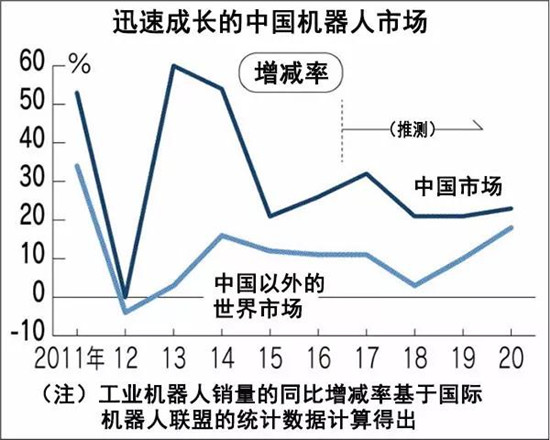 據國際機器人聯盟預測,到2020年全球工業機器人的銷量將比2016年大幅增長77%。其中,中國的銷量有望猛增至2.4倍。在中國,由于人工費上漲和獨生子女政策導致的少子老齡化趨勢,制造業一線的人手短缺情況突出。此外中國政府提出強化制造業的方針也促使企業加速引進工業機器人。